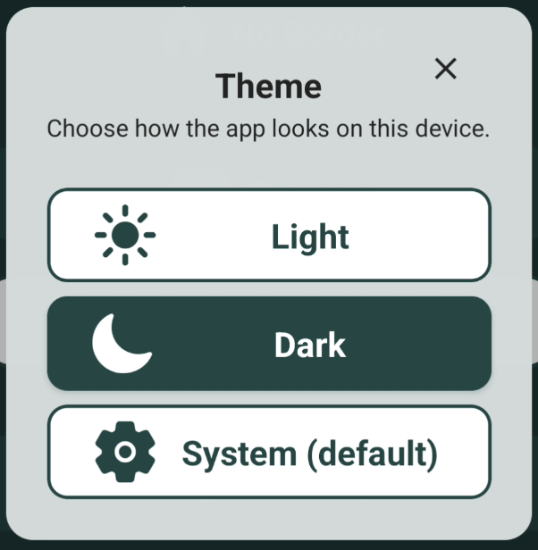import React from 'react';import { ThemeModal, TcbsButton } from '@tcbs/react-native-mazic-ui';const MyComponent = () => { const [themeModalVisible, setThemeModalVisible] = React.useState(false); return ( <> <TcbsButton title="No Border" variant="no_border" onPress={() => setThemeModalVisible(true)} iconName="home" iconPosition="left" /> <ThemeModal visible={themeModalVisible} onClose={() => setThemeModalVisible(false)} /> </> );};- Supports light and dark themes